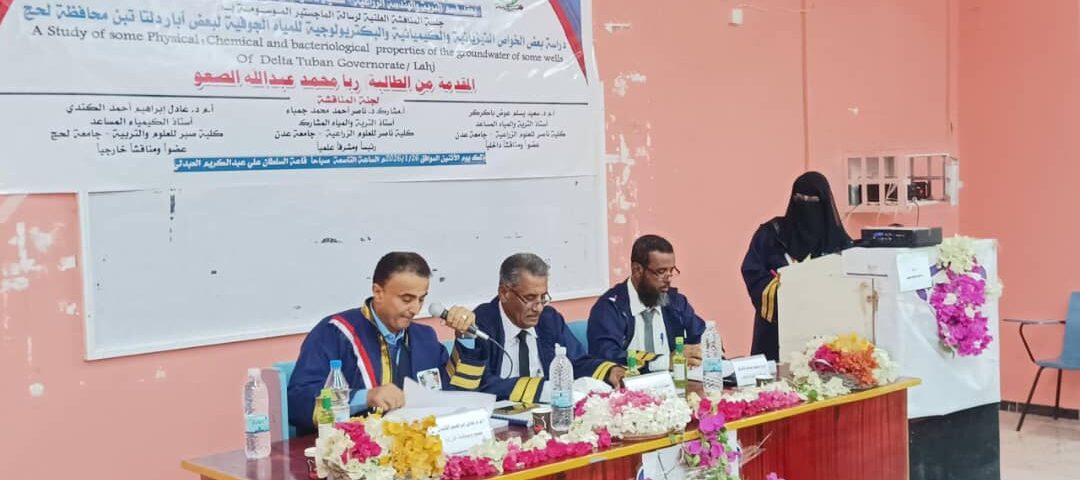 منحت كلية ناصر للعلوم الزراعية بجامعة لحج اليوم الباحثة/ ربا محمد عبدالله الصعو درجة الماجستير من قسم التربة والهندسة الزراعية عن رسالته الموسومةب دراسة بعض الخواص الفيزيائية والكيميائية والبكتريولوجية للمياه الجوفية لبعض أبار دلتا تبن محافظة لحج “.